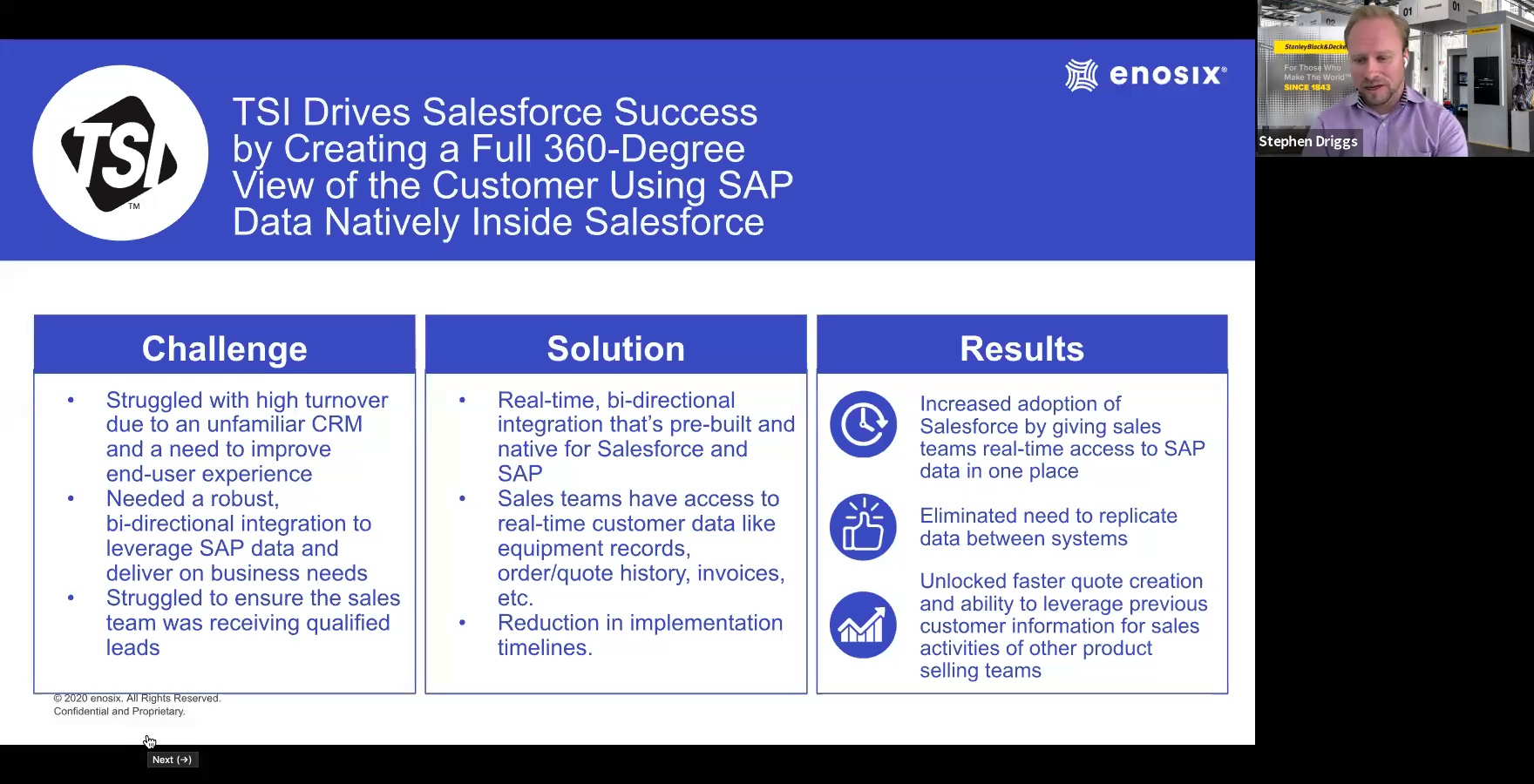 In this webinar, enosix CTO and Co-founder, Gerald Schlechter, will host a roundtable discussion with Stephen Driggs, Global Director of IT at Stanley Black & Decker, and Wade Krzmarzick, Director of IT, TSI Incorporated, about how their companies leveraged Salesforce/SAP integration to deliver business results faster. We’ll talk about their business goals, unique challenges in Salesforce and SAP integration, and the results from implementing enosix.
